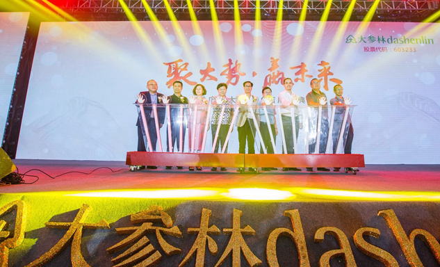 和记官网药业集团董事长刘景萍女士与大参林医药集团董事长柯云峰先生、中国医药商业协会执行会长付明仲女士等嘉宾共同开启了“聚大势•赢未来"大参林工商合作峰会的大幕。