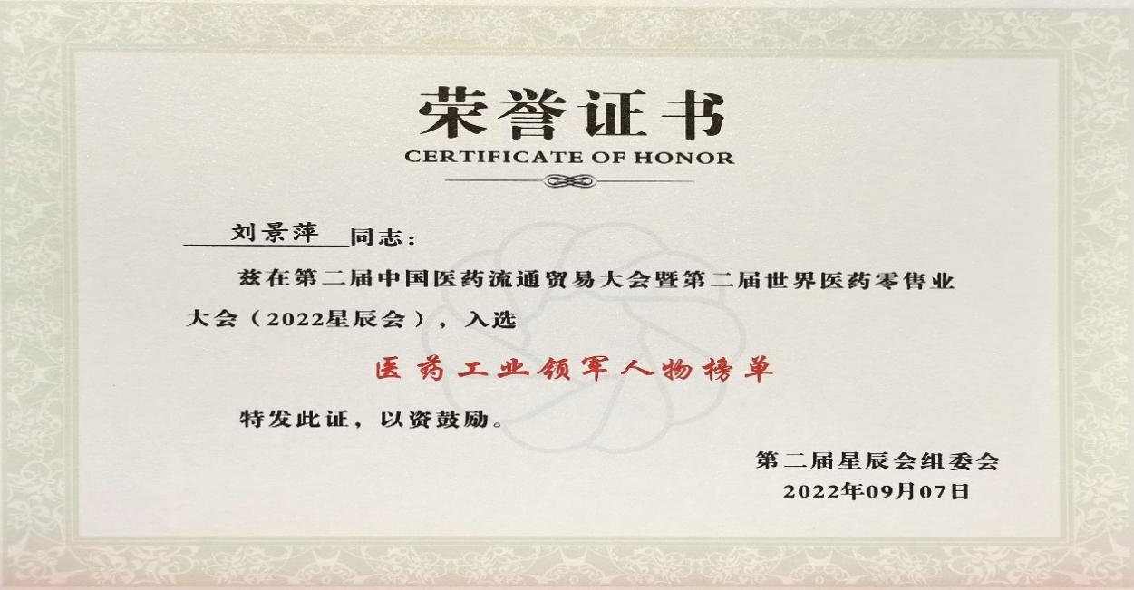 在本次开幕式上,发布了“医药工业领军人物”、“医药零售领军人物”榜单,和记官网药业集团刘景萍董事长凭借在儿药领域多年的努力探索和对行业的杰出贡献,荣获“医药工业领军人物”称号。
