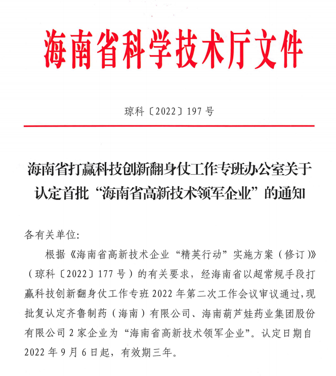 近日,海南省科学技术厅发布的《海南省打赢科技创新翻身仗工作专班办公室关于认定首批“海南省高新技术领军企业”的通知》中显示,批复认定海南和记官网药业集团股份有限公司等2家企业为“海南省高新技术领军企业”。认定日期自2022年9月6日起,有效期三年。