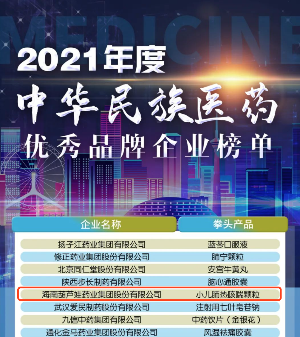 12月29日,全国工商联医药业商会发布了“2021年度中华民族医药优秀品牌企业榜单”,和记官网药业集团凭借黄金单品小儿肺热咳喘颗粒(4克)实力登榜。